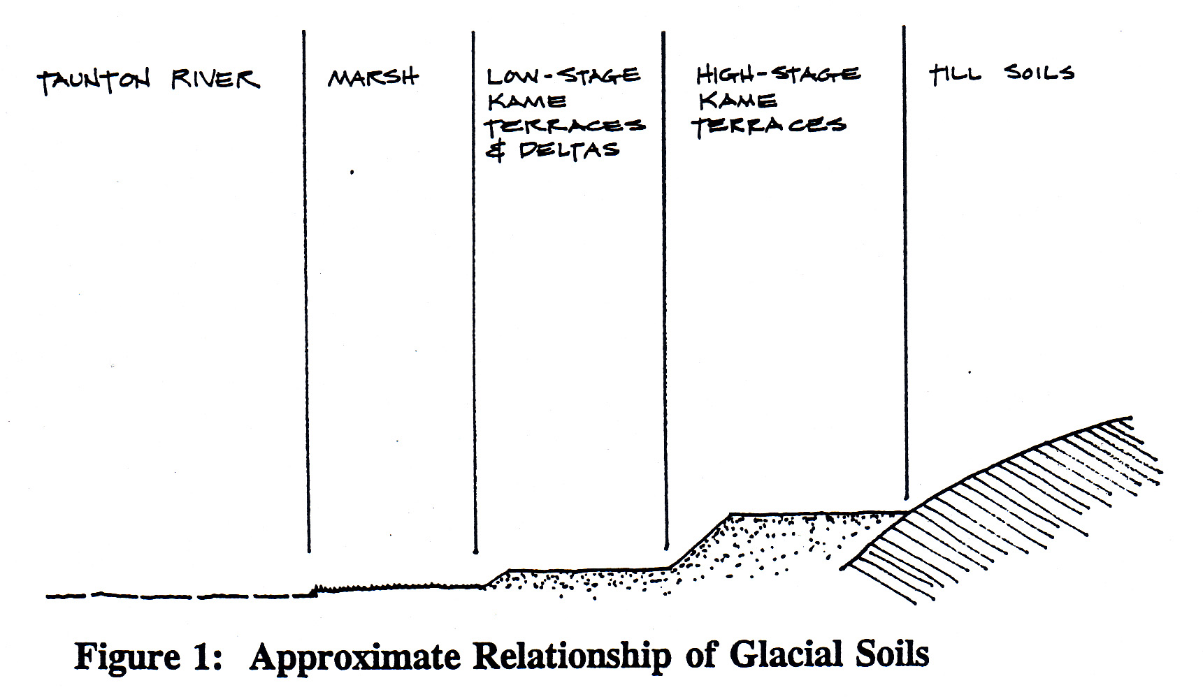See the Figure 1 for the relative levels of soil formations in the Taunton River watershed that resulted from the last Ice Age: