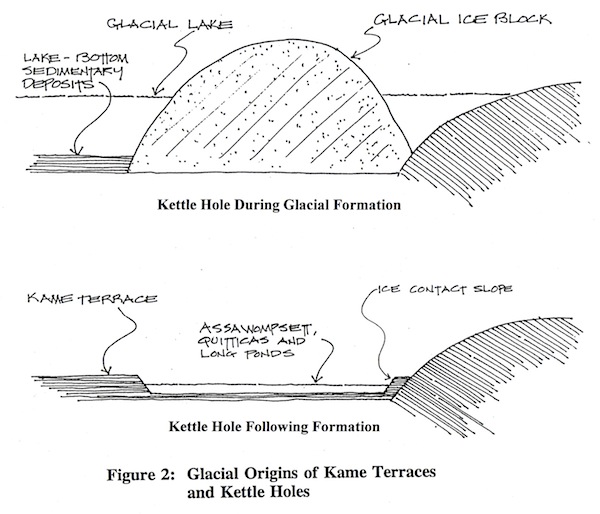 Formation of Ponds and Wetlands: Glacial outwash soils are characterized by many interesting land formations of historical interest. In addition to kame terraces---with their flat tops and steep ice contact slopes---outwash soils include formations such as kettle holes and eskers.