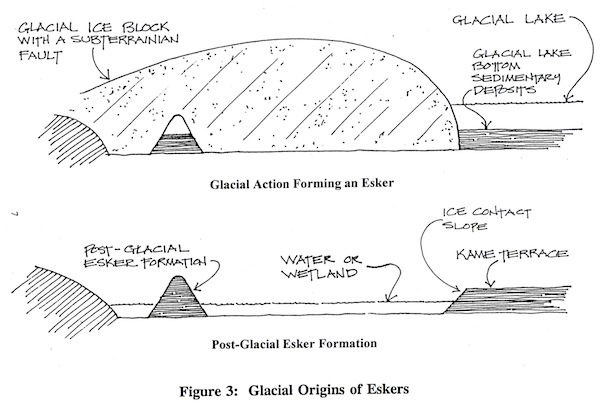 One of the more unusual and rare formations remaining from the last Ice Age are eskers. Eskers are elongated, serpentine hills of about 30 feet in height that were formed when fissures in glacial ice blocks allowed underground streams to course through the glaciers over thousands of years, depositing layers of gravel and boulders. When the glaciers melted, esker formations resulted. How eskers were formed is illustrated in Figure 3. Since eskers are valued for their gravel, most have been used as gravel pits and destroyed during the last 100 years. Few eskers remain in the Fall River area; however, one has been preserved in the Freetown-Fall River State Forest and another extends into the Taunton River north of the mouth of Mothers Brook at Barnaby’s Cove.