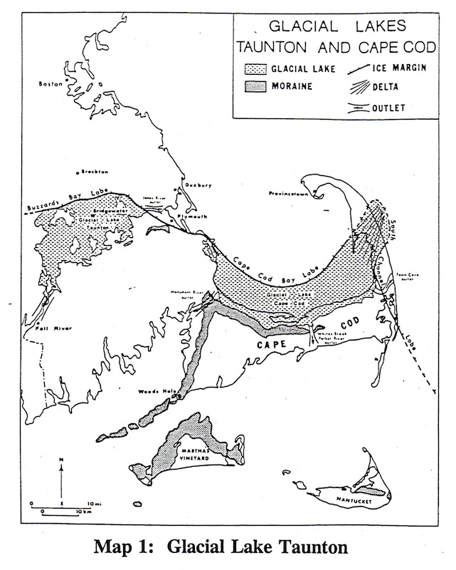 Glacial Lake Taunton: The Taunton River began as Glacial Lake Taunton, which was formed by the melting of glacial ice blocks and the damming of the meltwaters by ice and rock. Glacial Lake Taunton covered an area approximate to its existing watershed and extended from Bridgewater and Easton on the north, Mansfield and Norton on the west,