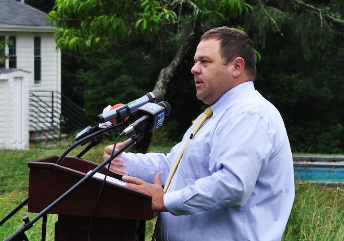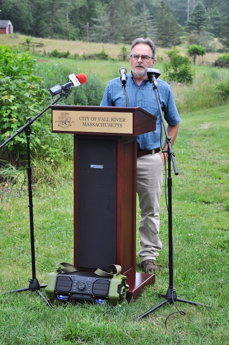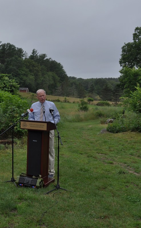 Fall River Mayor Paul Coogan gives opening remarks on the future site of the Bioreserve Educational and Discovery Center. Note the beautiful New England meadow and forest setting behind Mayor Coogan.
