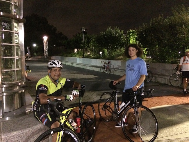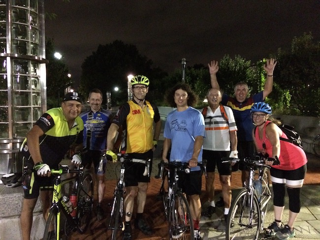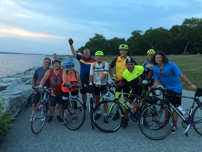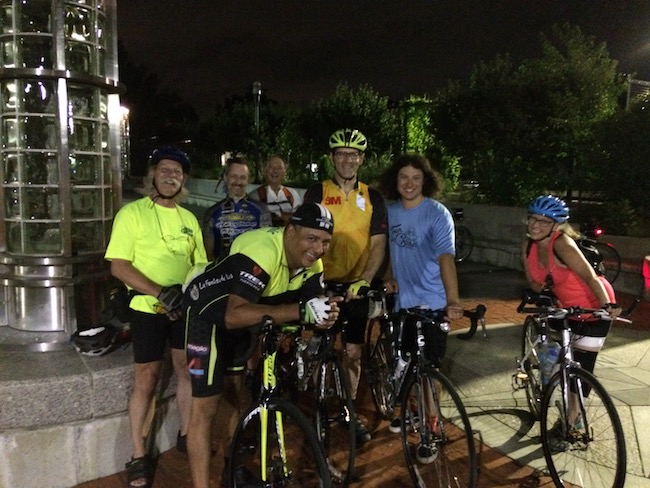 Friday was a great night for our Sunset/Moonlight ride. It was warm and muggy, but with an adequate breeze to offset some of that. Unfortunately when we reached our sunset viewing site the clouds moved in just enough to obscure the sunset. Moonrise was equally obscured. However the rest of the night was a smooth ride to India Point Park. After a brief rest on the bridge over I-195 we returned with an excellent moon view. We finished later than I expected. 11:15 PM is way past my bedtime. Here are a few shots of our enthusiastic group: