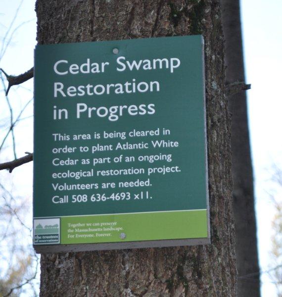 The Trustees of Reservations is restoring the remnant Atlantic white cedar stand in Shockley’s Swamp within the SMB. It is an exciting forest restoration project. If you’d like to get involved, or are simply looking for more information on the project, call the phone number listed on the sign in the photo below.