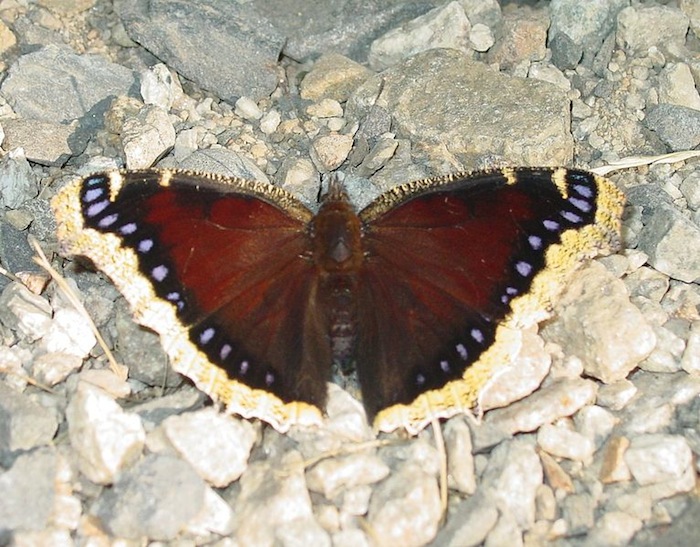 Let’s first take a close look at one of these hardy butterflies. The mourning cloak is a large forest butterfly with a 3 to 4 inch wingspan. The wings are a dark purplish-brown to maroon with a pale to dark yellow, ragged, irregular edge. Iridescent blue spots line the inner edge of the yellow band. These colors are the colors of traditional cloaks people wore, in the past, when they were in mourning …hence the name of this butterfly. The underside of the wing is colored a camouflaging pattern of grey and brown and the wing edge has the same yellowish band pattern as the upper surface of the wing. Males and females look alike.