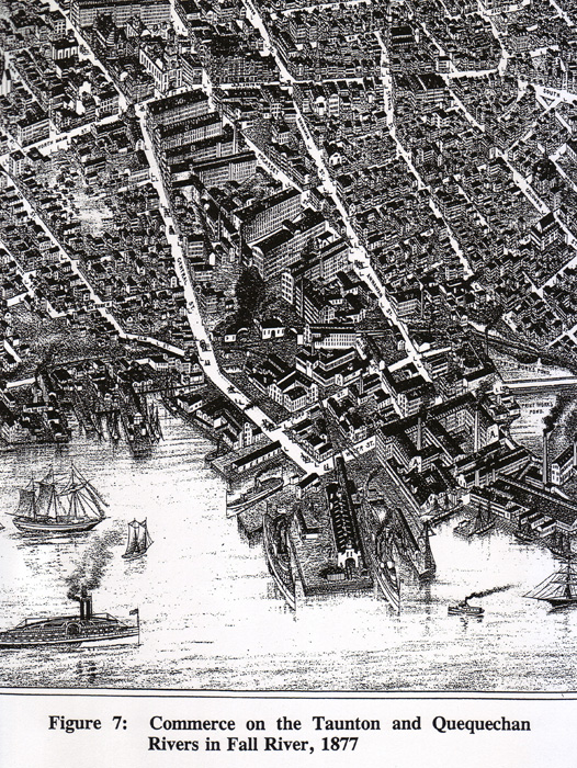 In addition to the reliable flow of water of the Quequechan River, its sound bedrock foundation, and its ownership in one family, the location of the river next to a navigable waterway, the Taunton River, made Fall River an ideal site for textile manufacturing. It was the combination of water power and coastal location—not one or the other---that accounted for the ascendancy of Fall River as a textile center.