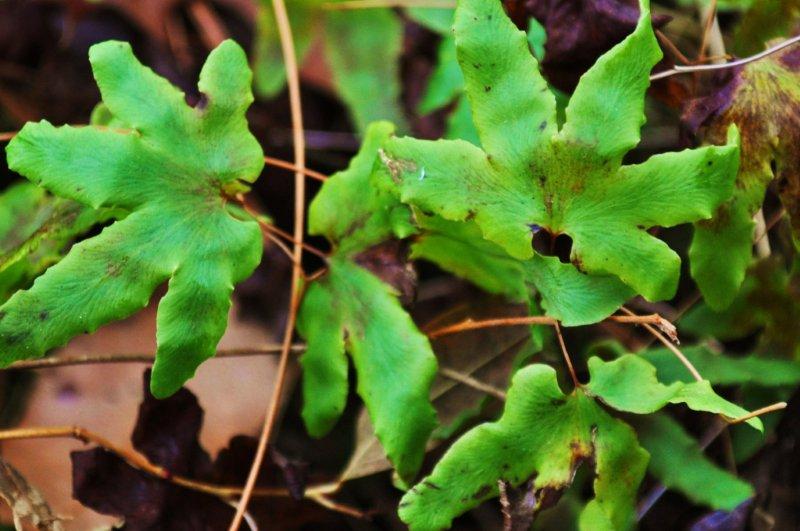Hand-shaped pairs of fronds grow along the vine. The terminal end of each vine bears the more delicately-divided fertile leaflets that bear the fern’s spores.
