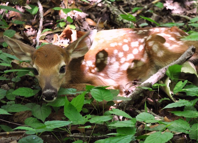 Sunlight blends with the fawn's dappled coat helping it stay hidden on the forest floor.