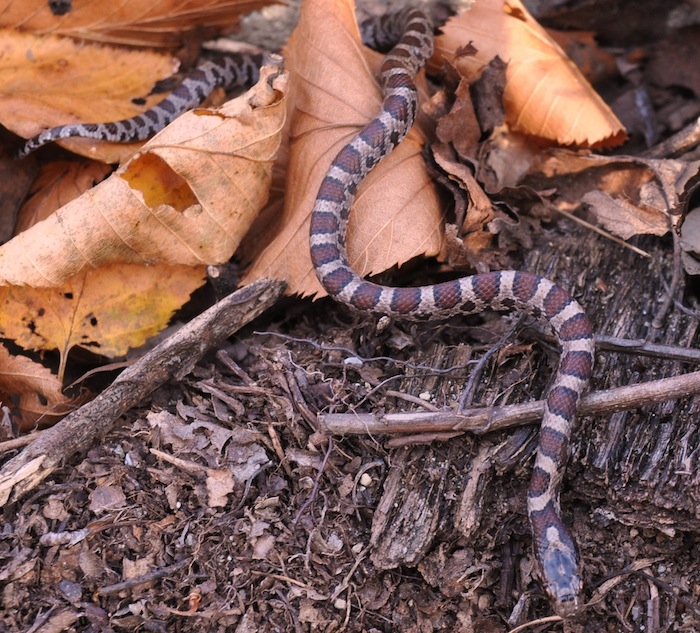 Attractively patterned baby milk snake explores the forest out in the Bioreserve.