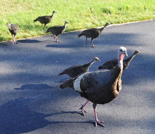 ![]() A hen wild turkey and her poults walking along the Alfred J. Lima Quequechan River Rail Trail.
