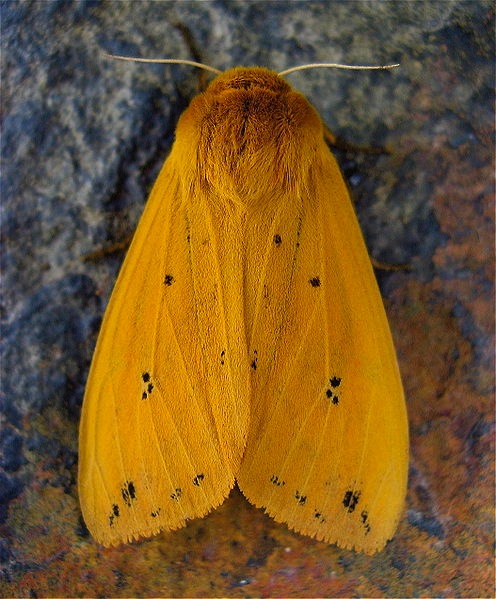 Isabella moths are a pale yellow to yellow-orange in color with a very furry thorax. They have a wing span of up to two and a half inches. The wings have small black spots scattered here and there. These moths have their forewings covering their hindwings when at rest.