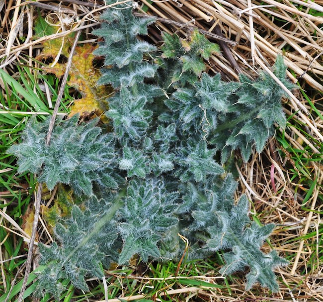 Don't walk barefoot in the meadow. Invasive thistles are greening up and starting to grow.