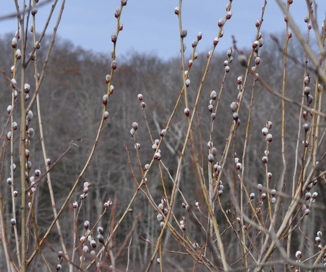 The pussy willow flowers wear a furry, soft coat. They are another very early March spring flower.