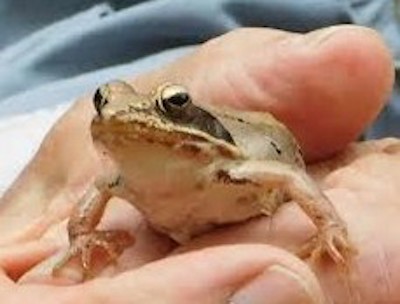 It is early March and sunny. The temperature is just above freezing and off in the distance you hear a flock of ducks quacking loudly from a small forest pool. Carefully walking over you don't see any ducks, but you do see small tan frogs with black masks quaking away. Wood frogs are the first frogs out of hibernation in area woodlands.