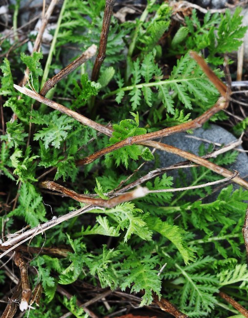 Yarrow is a member of the aster family and starts growing in early March. Although it resembles some introduced species and consorts with a whole bunch of alien weeds, yarrow is a North American native.