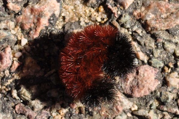 Woolly bears are black ...fore and aft ...and have a reddish-brown middle. In the late fall early colonial farmers consulted a local woolly bear to see how severe the upcoming winter would be.